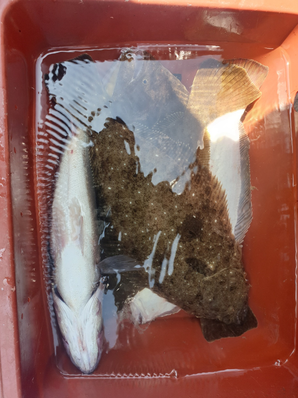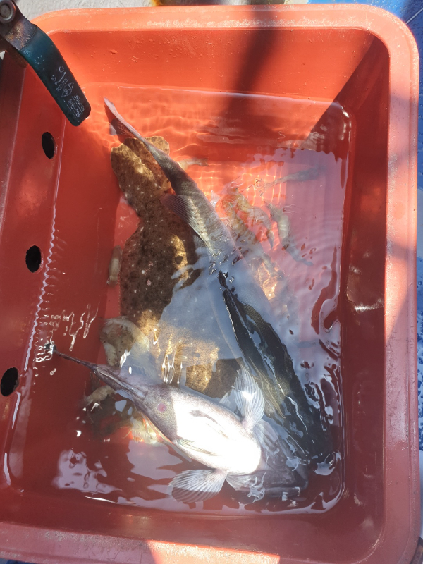 토요일 대사릿물 외수질 다잡아낚시 다녀왓습니다 대사릿물 이라서 아침 정조타임 기대하고달려가 봣으나 한마리로 땡치고더이상의 입질이 없어 이동ㅡ따문따문 농어 6마리 광어 30여수하고11시쯤 뻘물 지면서 입질 끊기자들어가자고들 하셔서 일찍 입항했네요 대사리에 탁한물색엔 답이 없네요더운데 고생하셧어요